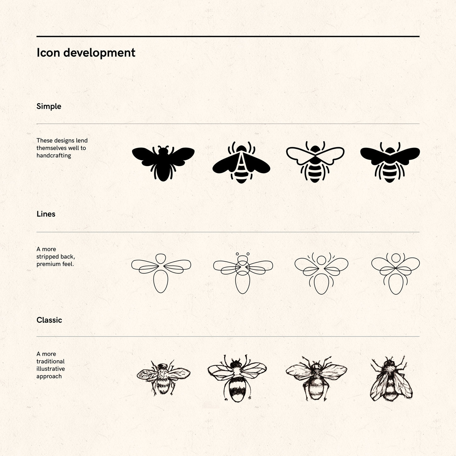 A branding and packaging project for a local honey producer. This project had a very small budget and the labels were hand produced, which meant keeping the labels simple and the design single colour. Small batch batch honey is great for the dwindling bee population. Unlike mechanically extracted honey, the bees are well looked after – this became the focus of our messaging and starting point for the design.